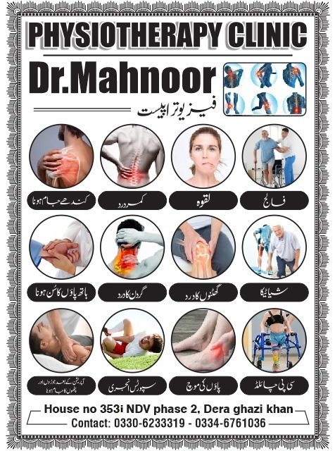 If you are looking for safe, effective, and compassionate physiotherapy care in Dera Ghazi Khan, Dr. Mahnoor is here to help. Specializing in physiotherapy treatments for ladies and children, D. Mahnoor provides personalized care in a comfortable and respectful environment designed especially for female patients and young children.